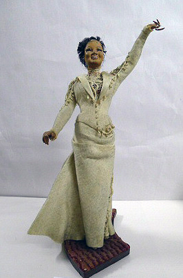 Included in the City Museum’s acquisition were 29 “Manikins” (mannequins). They are Barbie sized figures made with cotton fiber and glue. The detail of workmanship in the facial expressions, delicate fingers, poses, settings, and clothing designs rival the mannequins in the Theatre de la Mode produced by French designers after World War II. Bailey’s figures are dressed in beaded gowns, leather suits, fur coats, and African and Native American clothing. Their hairstyles include Afros, cornrows, and short blond bobs, appropriate to each character and clothing. Snake skin boots, sandals, gloves, and jewelry complement the clothing.