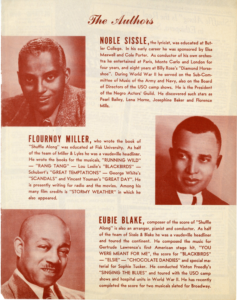 Last week, the Museum hosted a conversation with director Rachel Taichman and playwright Paula Vogel on their new theatrical collaboration investigating the performance history of the Yiddish play Got fun nekome (God of Vengeance). Their play, Indecent, opens next month at Vineyard Theatre, but this week’s blog coincides with the opening of another “history of” show, Shuffle Along, or the Making of the Musical Sensation of 1921 and All that Followed which opens on April 28th at the Music Box Theatre. Like the title suggests, it’s a new musical about the creators of the 1921 Shuffle Along, often called the first Broadway musical written by and for African Americans. To mark the opening, we’ll peek into the creative lives of Shuffle Along‘s songwriters, Eubie Blake and Noble Sissle.