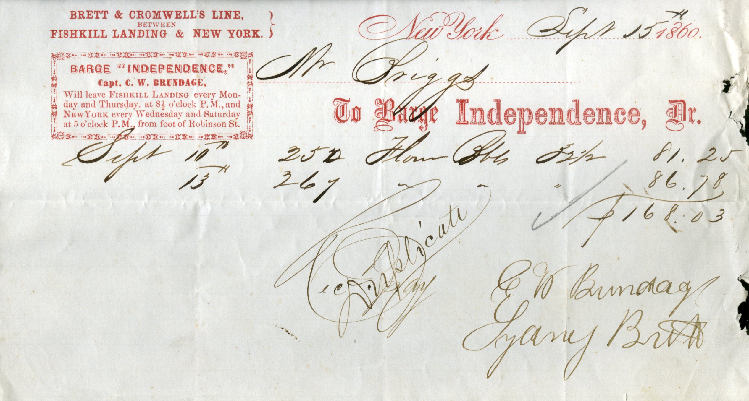 The first ships to travel in and out of New York, primarily via the East River, were brigs, schooners, and sloops. These small sailing ships were used domestically for mail and freight. They weren’t fast, but were quicker than shipping by land and served the purpose of getting goods where they needed to go. Documents such as the 1824 shipping receipt below were used by merchants to guarantee the safe arrival of goods. Later, as illustrated by the 1860 receipt of the barge Independence, shipping lines devised regular schedules.
