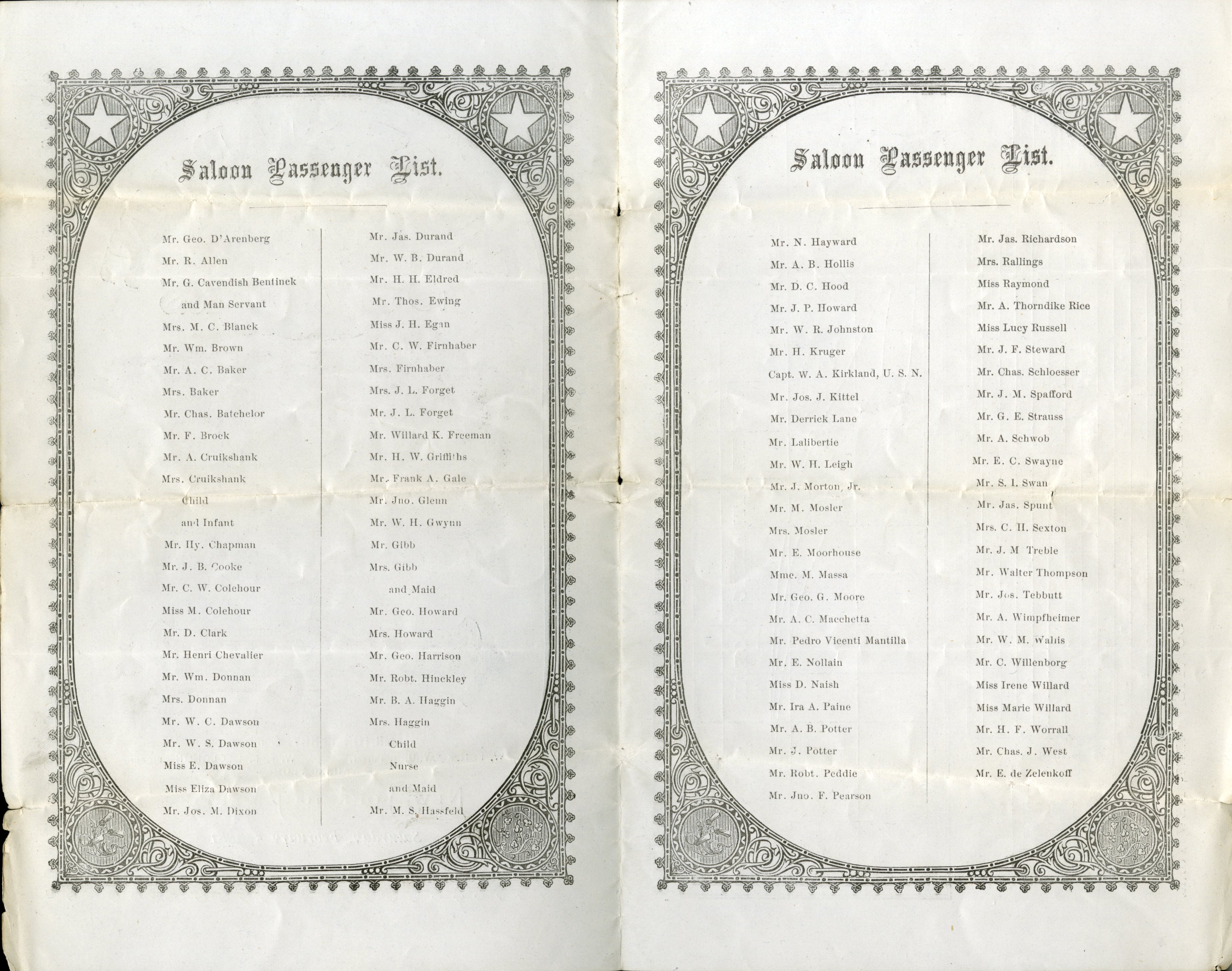 Passengers were informed of amenities that could be acquired on board, including interior cabin maps and passenger lists, prior to boarding. They also received social itineraries advertising the various activities during the trip. Pamphlets often included the company’s broad range of destinations and information on routes, which included route charts and passenger logs allowing travelers to keep track of their journeys as they sailed. Materials like these illustrate a shift in the shipping trade towards passenger travel from the prior focus on freight transport.