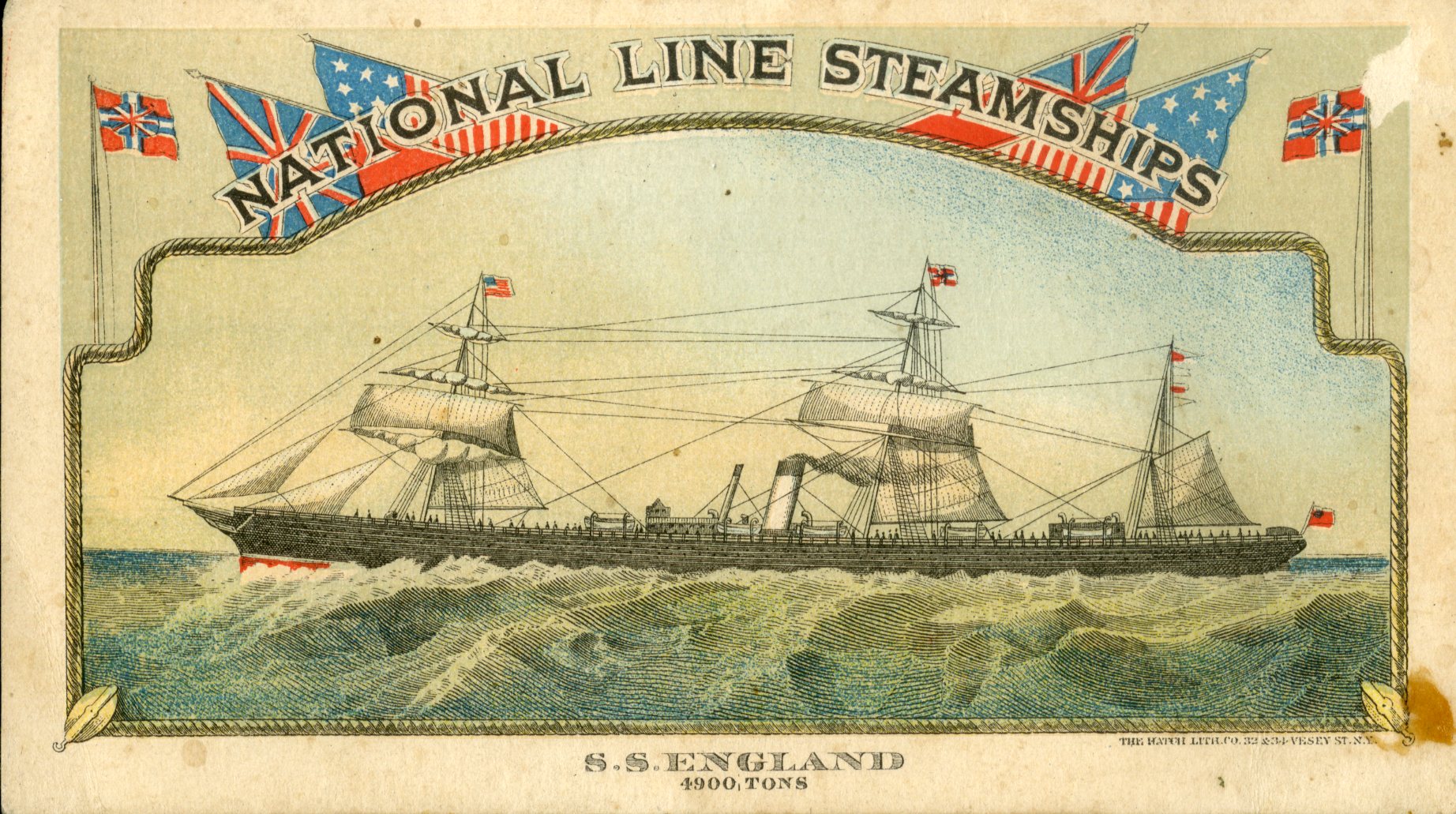 Steamships began frequenting the port of New York in the middle of the 19th century, and by the late 1800s, mail steamers had become the primary mode people used to cross the Atlantic. By incorporating a postal service, mail steamers wove passenger and cargo travel into a sustainable business model, which allowed mobility for the working class. Trans-Atlantic travel ranged around seven days, providing passengers with set departure and arrival times at each location. New York City served as the primary state-side terminal for passengers making the journey. The below sailing card depicts the S.S England, one of the National Line’s 12 passenger steamships sailing in and out of the port of New York. The back of the card provides passengers with information about accommodations and passage rates.