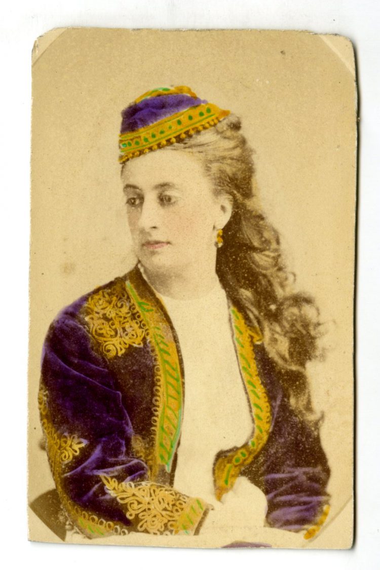 In the early years of photography, hand tinting was commonly used to add value to an image and bring it to life. Cheeks were given a rosy tint and skin shaded to look more natural. Hand coloring could be used to identify which aspects of the portrait the sitter (or photographer) considered worthy of highlighting, and helped to bring a performer’s vibrancy and extravagantly designed costumes to life.