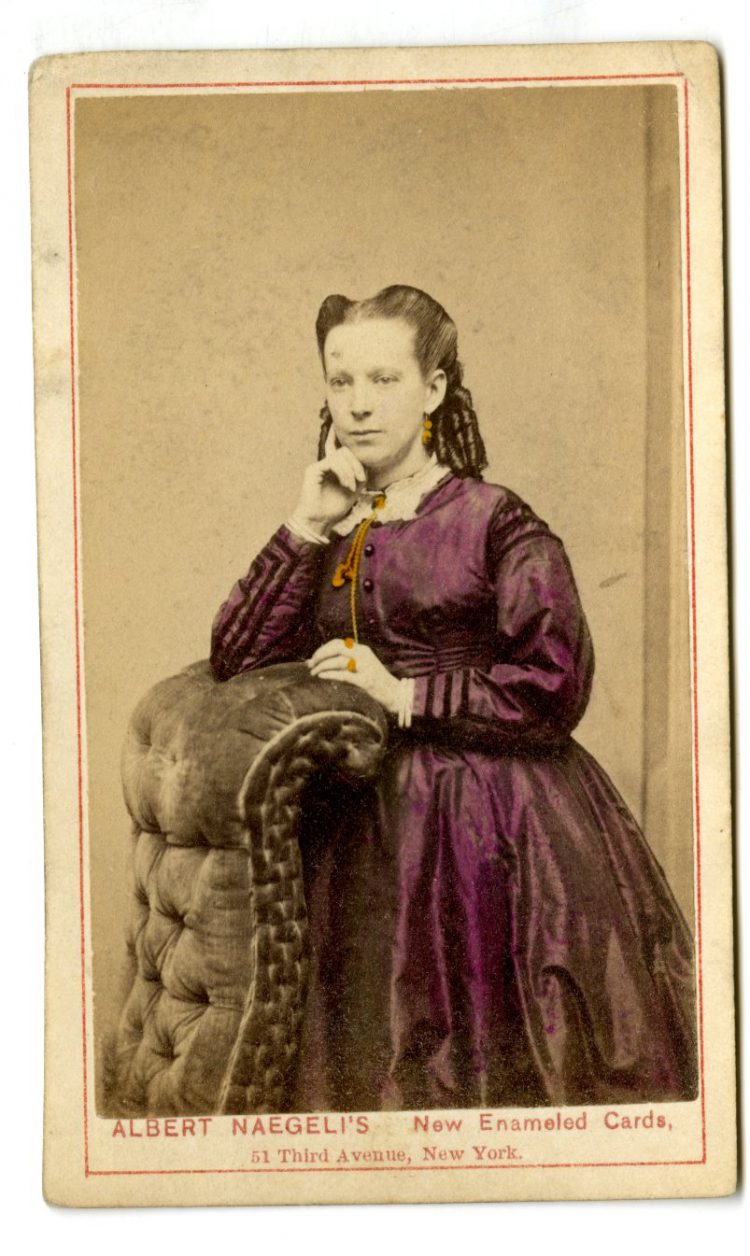 Some of the most intriguing photographs I encountered in the collection of cabinet cards and cartes-de-visites were hand colored, like the gilded portrait of actor E. A. Sothern seen above. Coming across these colored images amongst the seas of monochromatic photographs felt like finding buried treasure. As I examined them, I wondered about the factors that determined which photographs merited the special treatment. Was it influenced by the sitter’s fame or simply a service they had paid for?
