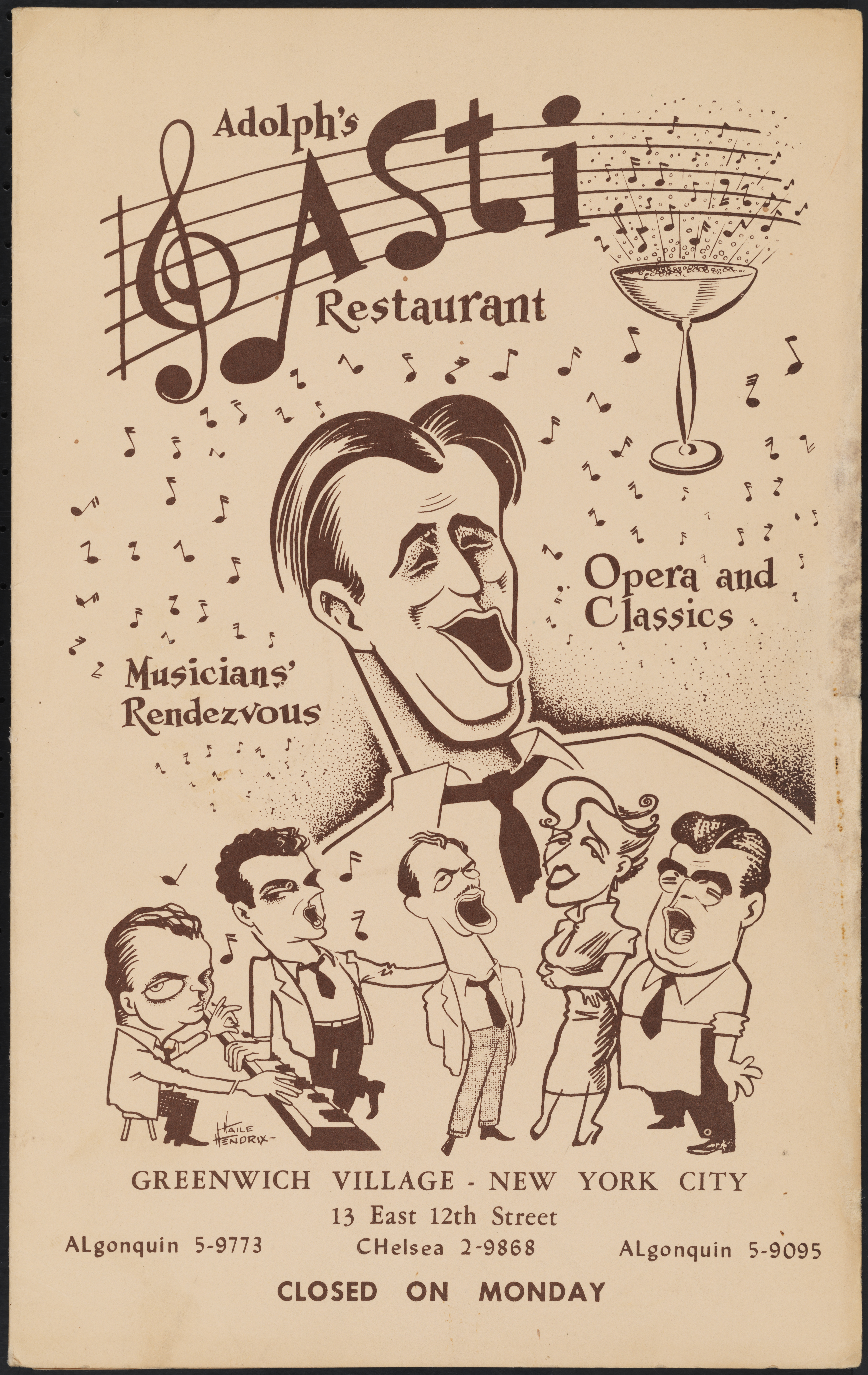 The Gustavademecum offers a more personalized account of what it was like to dine out in Manhattan during the 1950s, and complements the Museum’s collection of hundreds of restaurant menus; several establishments included in the guide are represented in our collection. According to the guide, diners visiting Adolph’s Asti Restaurant on East 12th Street could enjoy Italian fare that received a G- rating, just below “good enough to reward walking 1 mile or going 20 minutes out of one’s way”. Entertainment in the form of piano and “home-made” music was provided every day by four entertainers, and other patrons typically included suburbanite types, arts-personnel, and travelers. However, diners would almost need to shout to hear each other, and the toilets received a rating of 1.6 out of 5. Sosman noted the restaurant’s 580 opera and stage portraits as memorable, but he gave the overall décor a rating of just a 1 out of 9.