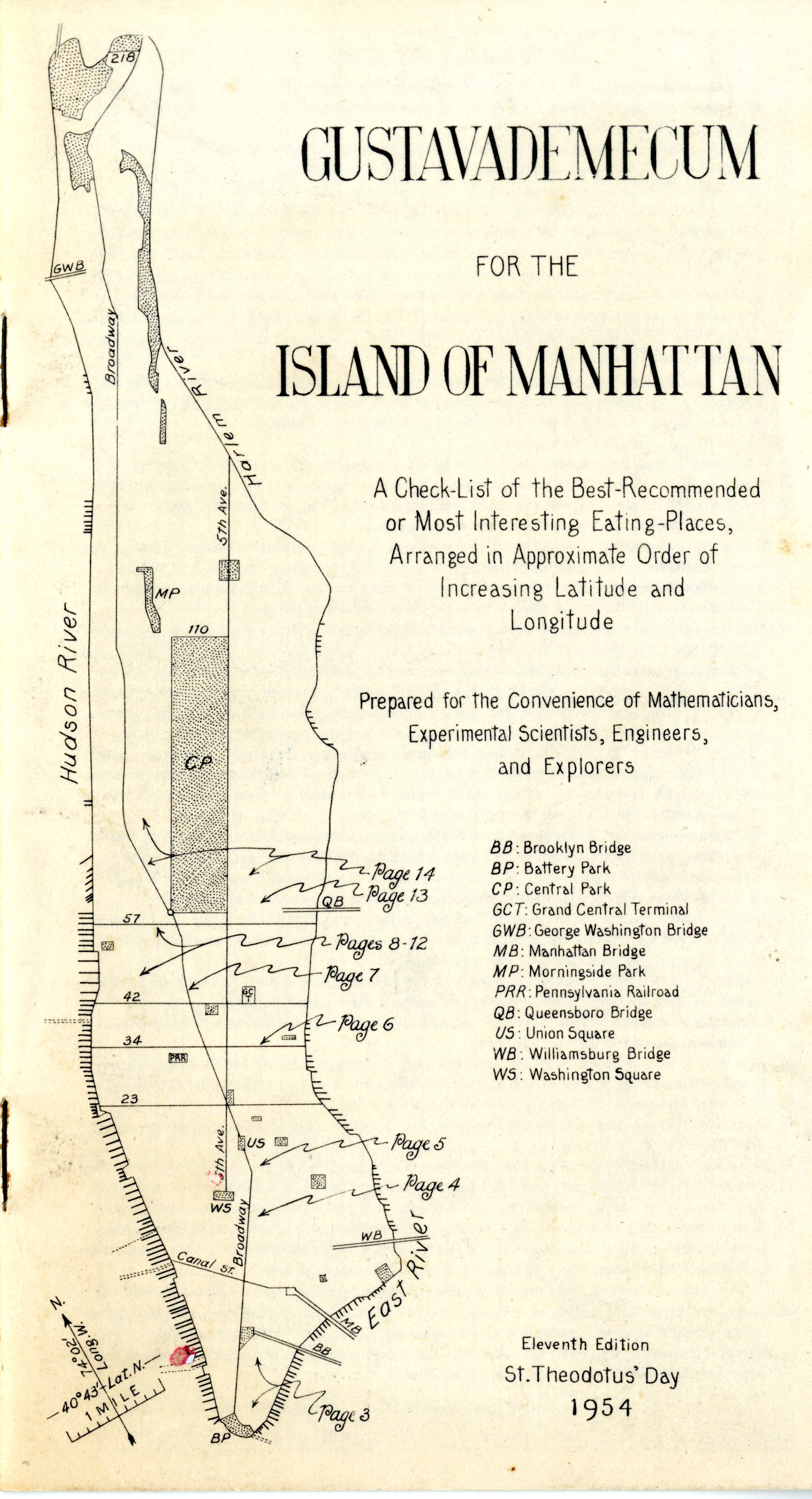 The Museum’s Manuscripts and Ephemera collection recently accessioned an object that helped me discover that the trend of reviewing and quantifying dining experiences did not begin in the 21st century with Yelp. The Gustavademecum for the Island of Manhattan or, A Check-List of the Best-Recommended or Most Interesting Eating-Places, Arranged in Approximate Order of Increasing Latitude and Longitude is an independently published guide to dining in Manhattan by Robert Browning Sosman (1881-1967). Sosman was an accomplished physical chemist and professor who lived in New Jersey and frequented New York City for business. Between 1941 and 1962 Sosman compiled data about his many meals in Manhattan restaurants and hotels, and self-published a yearly guide to distribute to friends and at conferences. The Museum’s edition dates from 1954.