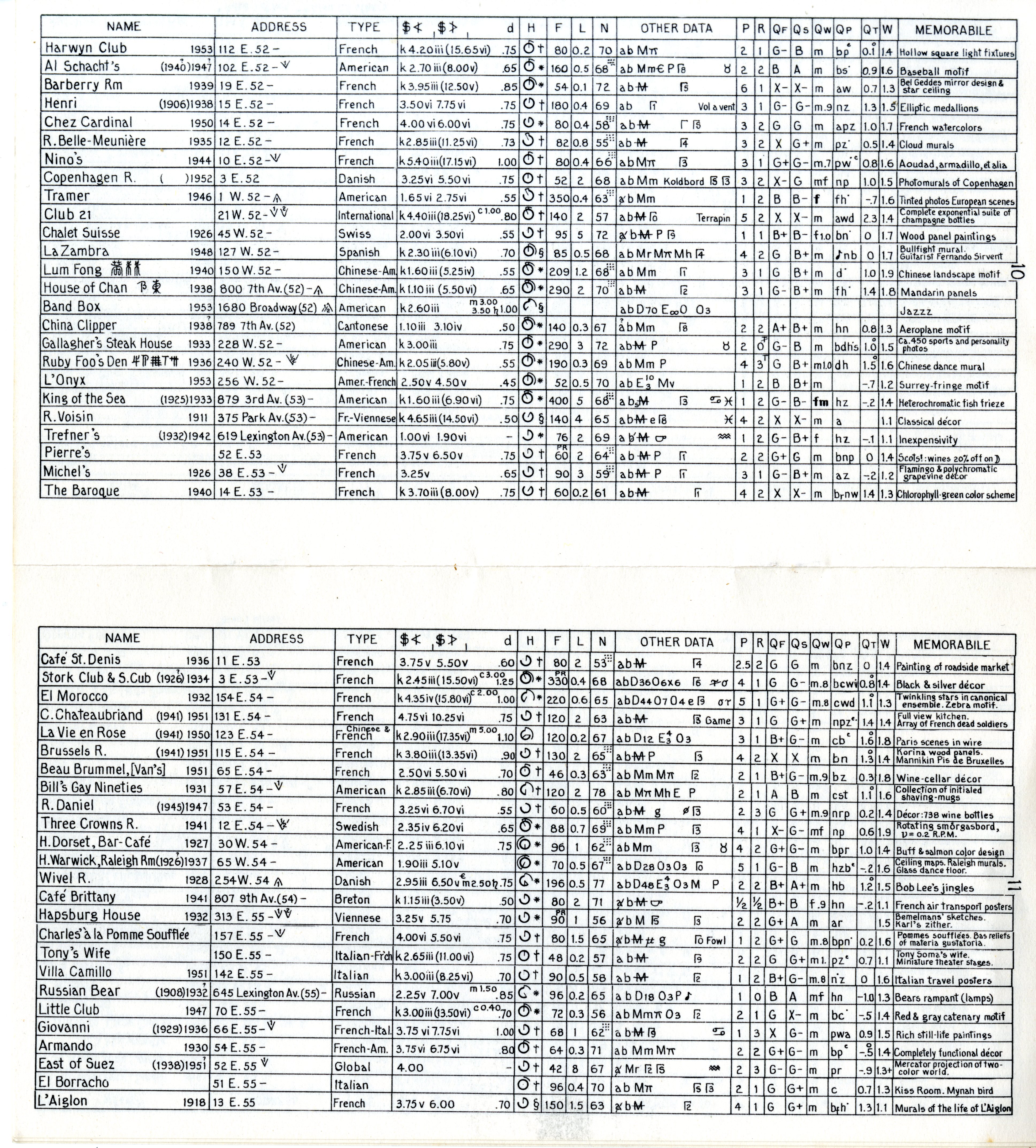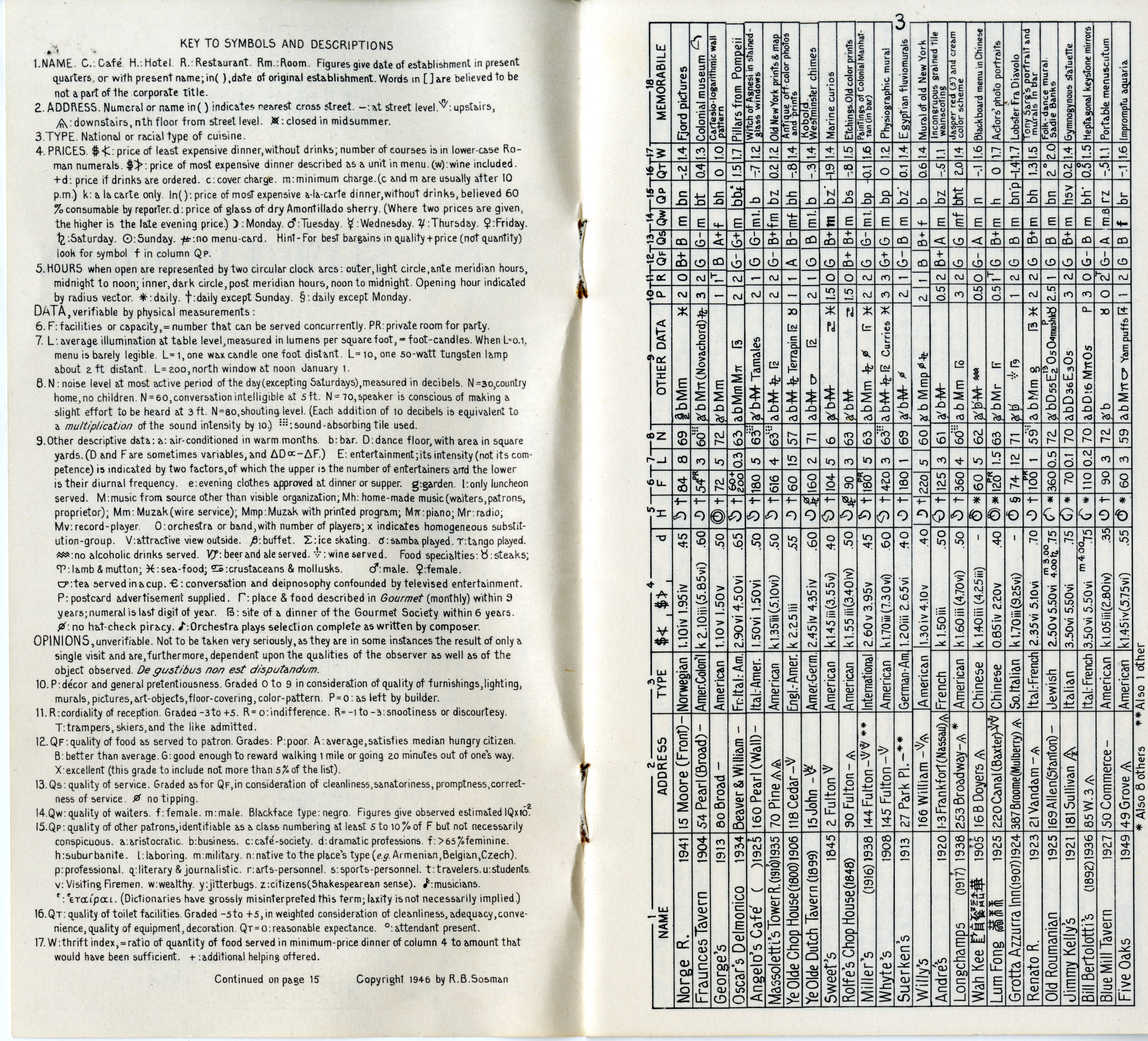 “Gustavademecum” loosely translates from Latin as “taste with me.” The guide is clearly aimed at a data-minded audience, and Saveur magazine describes it as a “gastronomic brain trust”. The pocket-sized pamphlet is organized geographically – the 300 selected restaurants are arranged in order of increasing latitude and longitude – beginning with the southern end of Manhattan. The entries include the usual, in-demand information about a restaurant, including its address, type of cuisine, price, and hours. The guide also includes more unusual information, which Sosman quantifies as either “data” or “opinions.” Data categories include the average illumination at a table, measured in lumens, and the “noise level at the most active period of the day,” measured in decibels. A restaurant could rate at the quiet end of the scale, “N=30, country home, no children”, to the very loud, “N=80, shouting level”. The “opinions” alert diners to the quality of décor, service, other patrons, and toilet facilities. Other patrons could fall into several categories, including business, suburbanite, students, jitterbugs, and “citizens (Shakespearean sense).” Diners could also refer to the Gustavademecum to check what type of music would be played in an establishment, whether or not “piracy” was apt to occur at the hat-check, or what level of “cordiality of reception” to expect. What makes the guide unique is that all of this descriptive information is communicated with a Sosman-designed system of glyphs, Greek letters, and mathematical and astrological symbols.
