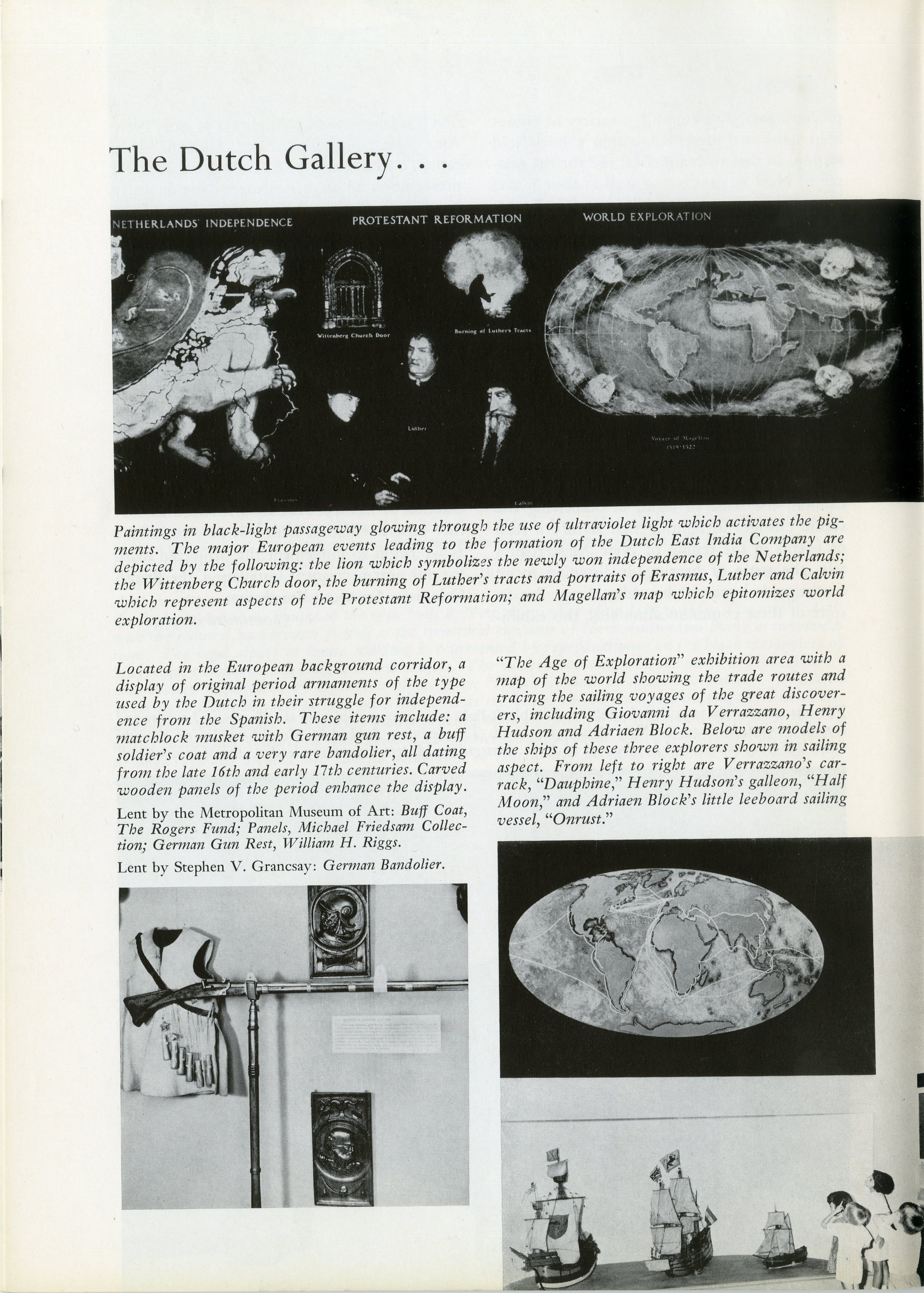A particular wave of experimental exhibition revamping began in the late 1960s, with the Dutch Gallery in 1966 (pictured above). The Museum implemented a new exhibition theory of “total museology,” which according to the annual report that year, allowed curators to form exhibitions using acquired, borrowed, or reconstructed objects, in contrast to traditional installations that relied on available artifacts to depict essential episodes in history. These exhibits were more participatory for visitors, as they required senses other than just sight. Visitors could touch certain aspects of the exhibition (though not Museum collection objects!), and listen to audio guides. In the Dutch Gallery, museum-goers entered through a black-light tunnel to denote time travel.