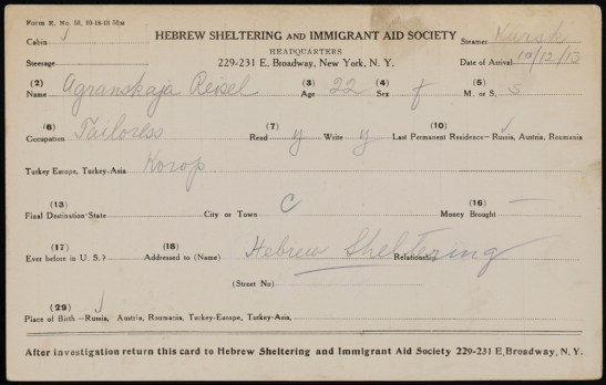 Hebrew Sheltering and Immigrant Aid Society. Immigration card for Agranskaja, Reisel. Arrived October 12, 1913 on steamer Kursk. Museum of the City of New York. 2015.11.3