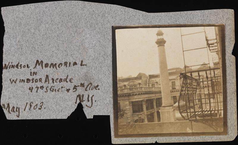 Windsor Hotel, which had been destroyed by fire just two years earlier. The fire, which will have its 118th anniversary this Friday, on St. Patrick’s Day, was reported to have led to 45 deaths, with over 40 people still missing at the end of the day. Toward the end of the article, Mr. Gray mentions a photo from the Museum’s collection which was identified in a handwritten caption on the photo (prior to accessioning into the collection) as a “monument to the Windsor Hotel dead.” Mr. Gray points out that in fact, this was a chimney for the heating and electrical plant of the arcade. I’m happy to