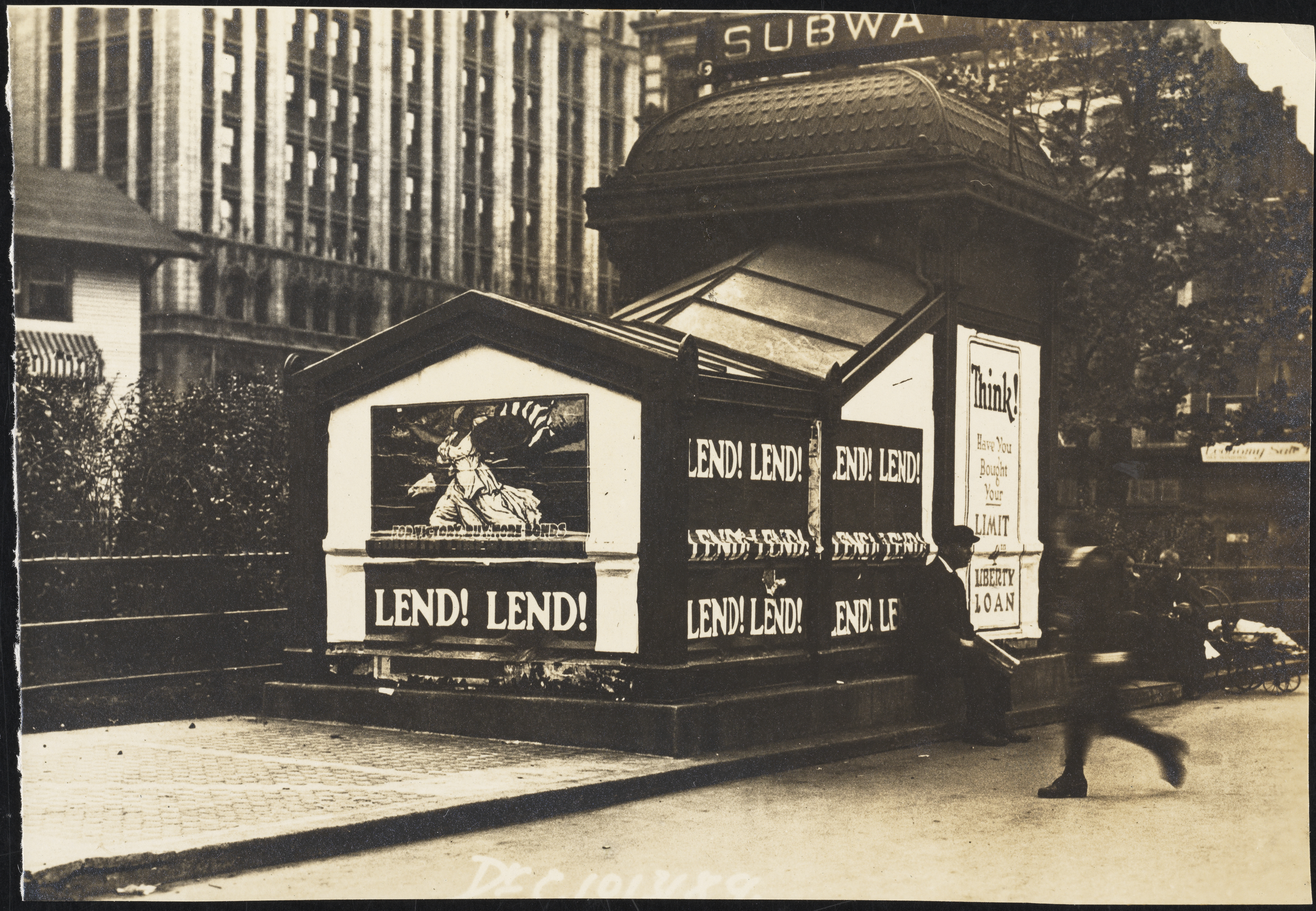 Unknown photographer. [Liberty Loan posters on a subway kiosk]. ca. 1917. Museum of the City of New York. F2013.143.104